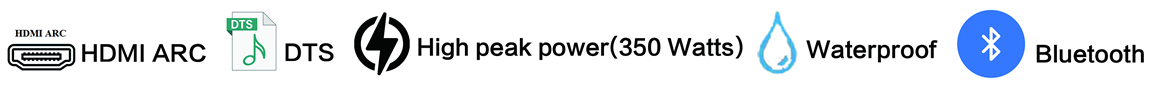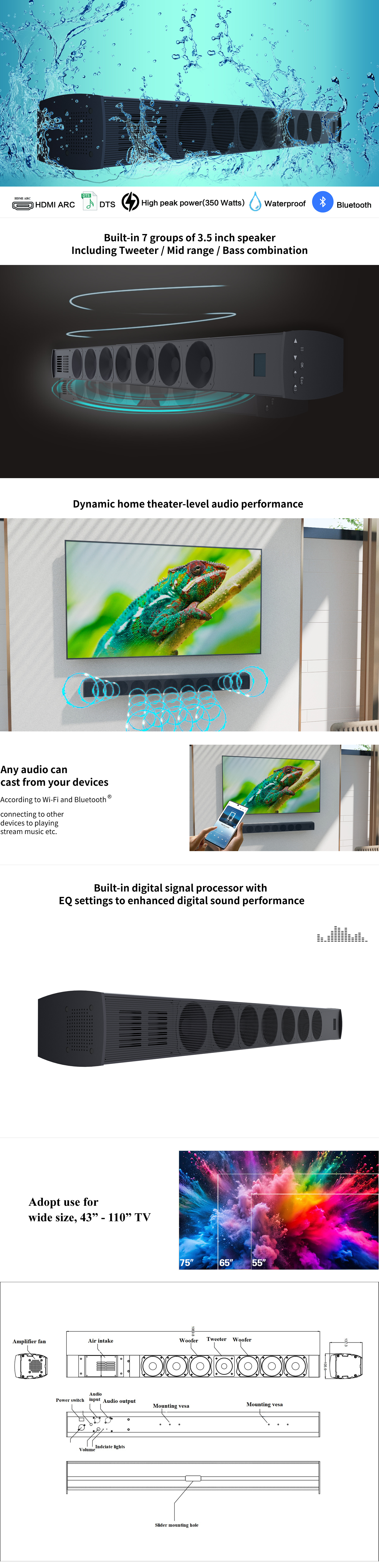 *Built-in 7 groups of 3.5 inch speaker*350 watts peaked power*Waterproof design of its interface*Optical/Audio jack/HDMI ARC/Bluetooth connected way*Including Tweeter / Mid range / Bass combination